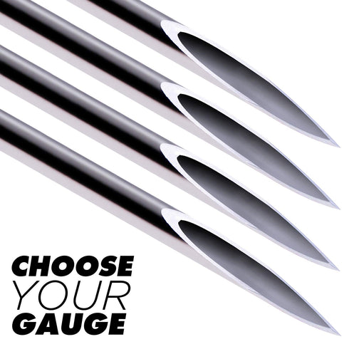 Premium grade, tri beveled body piercing needles by ACE Needles. Each needle is individually blister packed with a rubber protector installed on each tip. They are pre-sterilized with ethylene oxide (EO) gas. Each 2" long needle is precision turned from high grade 3161 surgical stainless steel. Manufactured to CE 0197, ISO 9002 and EN specifications.