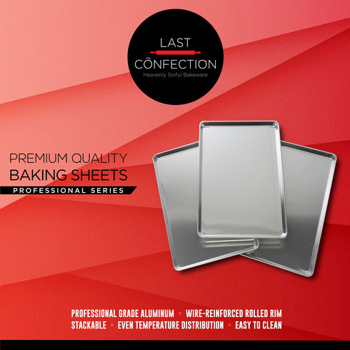 Bake decadent desserts, broil mouthwatering meats and roast the most delicious vegetables with these baking sheet pans from Last Confection. These professional, 18-gauge natural aluminum sheet pans are what every kitchen needs. From the seasoned restaurant chef, to an at home cooking enthusiast, or even a novice just getting started, these baking sheets are for you! These multi-tasking baking sheets will be the workhorse in any kitchen.