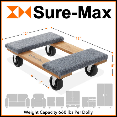 The 2-Pack of the Sure-Max Heavy-Duty 12 in. x18 in. Furniture Moving Dollies are professional padded moving carts that offer the ideal combination of value and reliability when it comes to protecting furniture, appliances, and other valuable items from scuffing, scratching, or breaking when being moved. Designed to be universally flexible for whatever you need to move, this tool is used by professional movers as a cost-efficient way to protect your home or office from the most common type of damage during a move. With an overall length of 18” and a width of 12” and topping out at 5” above the floor, this mover dolly is designed for both the professional and DIYer. Each of the 3” poly wheels sit on a swiveling steel base, providing a strong support and smooth ride. Combined with the hardwood frame and gray commercial grade polyester padding, the furniture dollies each support up to 660 lbs. each. You can look forward to faster and more efficient moves with the included 2 sets of dollies that can be used to support larger and heavier items or just to move more items in less time.Whether you are an individual doing a home move or a professional mover or cargo hauler, this set of Sure-Max Heavy-Duty Furniture Moving Dollies are perfectly suited for every move. Take the stress out of moving with peace of mind that large, bulky items will arrive safely and intact with Sure-Max Moving Dollies. Sure-Max is a trusted supplier within the moving and transport industry, offering a wide selection of premium moving blankets and supplies.