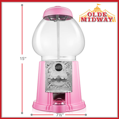 The Olde Midway gumball machine is a nostalgic candy dispenser that brings you back to the times of visiting candy shops. This charming gumball machine captures the essence of vintage design, with its sturdy metal base and gleaming glass globe. Standing 15 inches tall, it's the perfect size to display on a countertop, in a home game room, at the office, or at the entrance of a storefront.