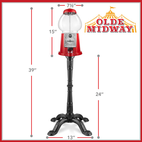 - Dimensions: Olde Midway's 15-inch gumball machine with stand makes a great gift. This large candy dispenser measures 7-1/2" wide x 7-1/2" deep x 15" high. The metal stand measures 13" wide x 13" deep x 24" high. Display this antique-style gumball machine in the home, office, or storefront.