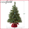 Crafted with meticulous attention to detail, this 2-foot miniature Christmas tree is extremely realistic. Featuring individually crafted branches, its lush, full shape and unique dark hue provide a perfect backdrop for your holiday decorations, making it indistinguishably lifelike. This tree is constructed to last through many holiday seasons. Its branches and needles are flame retardant and non-allergenic, combining safety with beauty across 90 meticulously crafted branch tips. It comes pre-lit with 40 LED lights powered by 3 AA batteries (not included), adding a warm, sparkling glow to your holiday setup. This compact tree is encased in a decorative velvet bag with a twine wrap, making it ideal for small spaces and perfect for enhancing tabletops, centerpieces, or any display area in homes, offices, or classrooms. Ready to display straight out of the box with no assembly required, it is an effortless addition to holiday décor for those with busy lifestyles or limited space. Just unpack, arrange the branches to achieve its full, attractive shape, and enjoy the festive spirit it brings. Dimensions: 24” H x 18"D x 18"W, featuring 90 tips and 40 LED lights