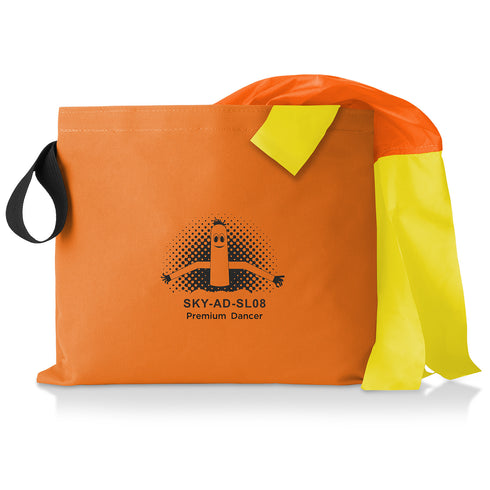 These 20' tall (18" diameter) dancers fit standard 18" diameter dancer blowers, and feature a 3" wide hook and loop fastener made to attach the dancer to the blower. They are crafted from puncture-resistant rip-stop nylon with a protective UV treatment to prolong the material life and color, and a nylon bag is included for storage. A dancer blower is also included. Designed for inflating inflatable dancers, it is 18" in diameter, fits all dancers that are also 18" in diameter, and has a 2" wide hook and loop fastener around its upper edge. This fan has a powerful 1 horsepower motor, yet is quiet for use both indoors and out. Its durable polyethylene composite housing can withstand abuse and resist impacts, a strong 19" square base has four locking casters in non-marring rubber, and grill covers over the top, bottom, and sides keep debris out of the fan. Three speed settings allow you to set the fan's output intensity and manipulate how your dancer moves, and two carrying handles are on the sides. The center of the top grill cover is pre-drilled for mounting a light kit (sold separately), and a 14' long, USA-standard, grounded power cord is included and wraps around the fan body for storage. Certified compliant to CSA and CAN North-American safety standards. ETL listed and conforms to UL specifications. Safety warning: Always use a GFCI protected receptacle and extreme caution when using any electrical appliance near wet or damp areas; do not submerge or use in standing water. Dancer Size: 20' tall, 18" dia. Blower Size: 21.5" long, 19" wide, 20" tall. Blower Weight: 36 pounds. Blower Electrical: 115v, 60Hz, 7.1-7.4-8.3 amps (depending on power setting), 1 HP motor, 3200/3300/3400 rotations per minute (depending on power setting). Includes: One single-legged dancer w/carrying bag, and one dancer blower with four casters and owner's manual.