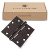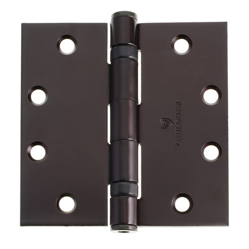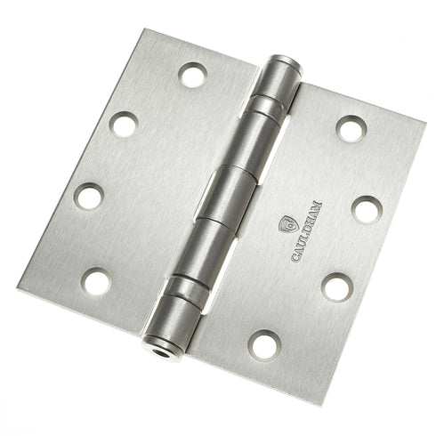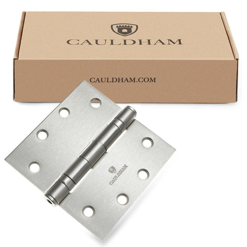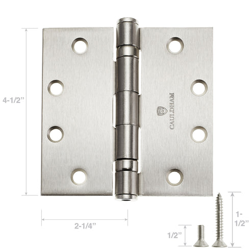 These commercial-grade ball bearing hinges from Cauldham provide the utmost in performance. Crafted from high-grade, cold-rolled steel, these hinges feature a stunning, corrosion-resistant finish and are superior in tolerance, concentricity, and straightness. The hinge leaves are tightly machined to minimize play and utilize smooth, anti-friction ball bearings to allow for smooth and quiet operation. They are ideal for heavy wood and steel commercial (and other intensive use) doors, in both interior and exterior applications. The pin is permanently lubricated and non-detachable for security, and the pin cap protects the bearings from moisture and dust. These are approved for use on fire-rated doors and meet ANSI/BHMA standards. Hinges are mortise mount (designed to be flushed into the door and jamb, as opposed to surface mounted), and are sold in a set of 3. Each hinge leaf is 4.5 inches in height and is pre-drilled with four countersunk holes arranged in a half moon shape. Eight No.12 - 1/4" wood screws and eight 1/2" machine screws are included per hinge for fast and easy installation in any type of door. Hinges have approximately a 270-degree range of motion. Cauldham is the premier source for professional-grade hardware and fixtures that combine stylish design with exceptional reliability and durability.