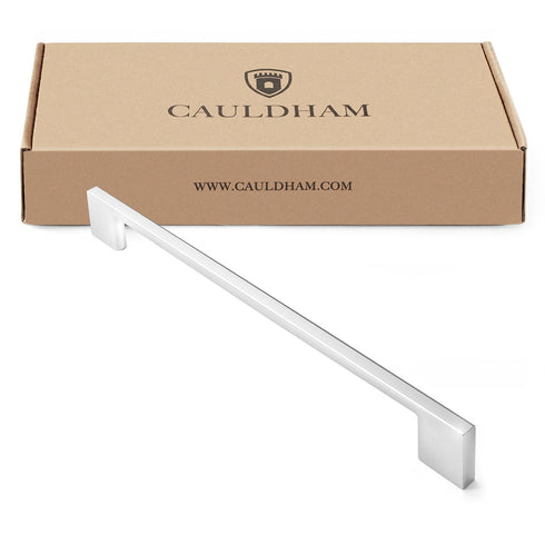 Add functionality and stunning design to any cabinet door, drawer or furniture with this top-quality Cauldham pull. Whether refurbishing existing cabinetry or building new, this hardware instantly accessorizes the kitchen, bathroom, or anywhere else, and provides a stunning design suitable for almost any decor. Crafted from a precision blend of top-quality metal alloys, this professional-grade, substantial weight hardware is constructed for the ultimate durability and hand-finished for consistency & aesthetics. This pull is built-to-last, making it ideal for both residential and commercial use (or for any other highly intensive use or heavily trafficked area). Installation is simple, each pull includes: 1", 1-1/2", and 1-3/4" mounting screws, allowing this hardware to fit various thicknesses of doors & drawers (If another length is needed for your application, simply use a standard 8-32 thread machine screw). Handle length 10-1/8", hole centers 9"(229mm), and projection 1". Cauldham is the premiere source for professional-grade hardware and fixtures that combine stylish design with exceptional quality and durability.