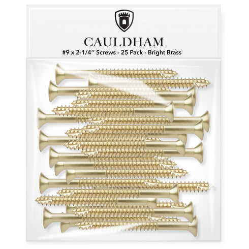 Whether your project is renovating an existing set-up or for new construction, interior or exterior, these heavy-duty hinge screws from Cauldham provide the utmost in performance and durability. Crafted from a precision top-grade alloy steel, these screws feature a stunning, corrosion-resistant finish and are superior in tolerance, concentricity, and straightness. Boasting a self-drilling tip, each of these top-grade screws use a standard flat head that requires a Philips Head screwdriver or bit for a quick and easy installation. Color matched to the most common door hinge finishes, these screws will maintain a professional and stylish appearance when upgrading your home. These screws are perfect for securing hinges on doors, cabinets, and other furniture as well as any other project needing a top-grade wood screw. These No. 9 x 2 ¼” wood screws are partially threaded to create a much better and stronger fit, increasing the security of your doors. Each set includes 25 screws, ensuring you have plenty for multiple projects.Cauldham is the premier source for professional-grade hardware and fixtures that combine stylish design with exceptional construction and durability.