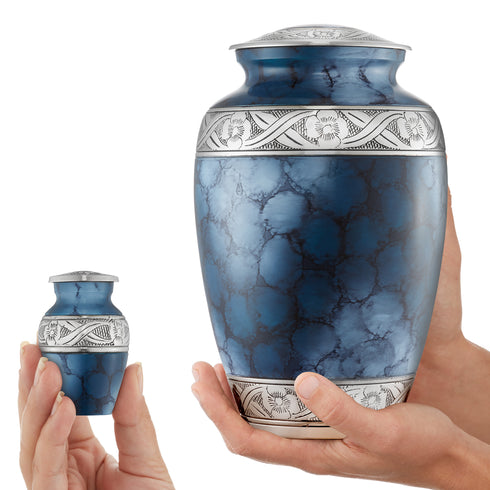 - 5 Piece set: Reminded urn sets are comprised of one large adult urn and four matching miniature token urns. The adult size holds remains weighing up to 210 lbs. Token urns are the ideal size to share a small momento of your loved one with others.