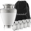 - 5 Piece set: Reminded urn sets are comprised of one large adult urn and four matching miniature token urns. The adult size holds remains weighing up to 210 lbs. Token urns are the ideal size to share a small momento of your loved one with others.