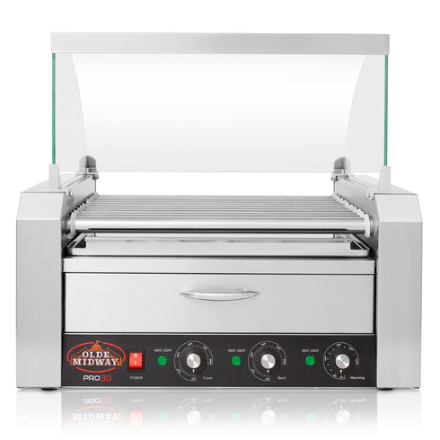 - Commercial-grade: Constructed of heavy-duty stainless steel, the PRO30 commercial-grade hot dog griller features a built-in bun warming drawer. This commercial-grade 1600-watt hot dog griller features 11 non-stick rollers that can cook up to 30 hot dogs at a time. These slow rollers rotate a full 360 degrees, cooking all items uniformly. This machine is suited for grilling a variety of hot dogs, sausages, taquitos, and more, all while keeping your split bun rolls warm.
