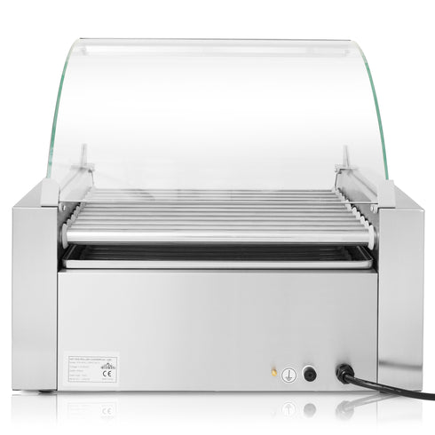 Olde Midway's electric hot dog roller machine with bun warmer and glass cover makes it easy to prepare mouth-watering rotisserie style hot dogs. Cook up to 30 hot dogs at once on the 11 stainless steel rollers.