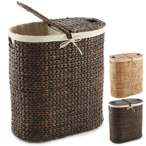 This woven double laundry hamper basket from Casafield is perfect for use in bedrooms, bathrooms, laundry rooms, closets, or anywhere where added laundry storage is needed. It features an oval 2-section design with dual hinged lids for a stylish storage solution to conceal dirty clothes, blankets, and towels until laundry day. Crafted from beautiful natural water hyacinth material, this clothes hamper adds a touch of classic charm to any space while offering practical functionality.