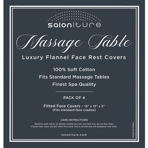 Give your clients a massage to remember every time you use our premium Saloniture flannel face cradle covers. The luxurious 100% cotton, double-brushed flannel sets the stage for ultimate relaxation to provide a perfect experience for your client. Sized to fit most standard crescent shaped massage table face cradles, these covers measure 13” x 13” x 5”. They slip on easily and stay in place with elastic edging and fit snugly around the inside and outside of the face pillows.Natural fiber covers are pre-shrunk, non-pilling, with reinforced seams in premium weight cotton flannel. Hypo-Allergenic and machine washable and dryable for easy care. Package includes four reusable premium flannel face cradle covers. Available in a wide variety of colors to match all Saloniture massage linens.Saloniture designs reliable massage equipment and accessories, trusted for use in professional settings including spas, salons, and clinics.