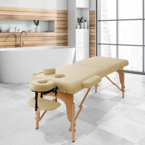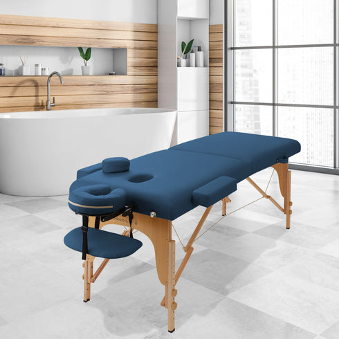 This Saloniture portable massage table combines luxurious comfort in a convenient, fold-and-carry design ideal for both certified massage therapists as well as at-home bodywork enthusiasts. This table offers premium comfort, ultra-padded with 4" of foam. 1-1/2" of specially designed memory foam atop 2-1/2" of our premium foam. This unique foam combination creates deluxe cushioning, providing the ultimate comfort for your clients. The armrest wings are composed of a plush, 2" thick layer of high-density foam, and the face pillow contains 3" of foam with a removable cover. Constructed with an adjustable headrest and removable winged armrests for additional customizable comfort. The table features professional-grade craftsmanship, including a sturdy hardwood frame along with double tension knobs on each leg for extra stability. Its support cables are composed of durable steel used in automobile brake construction, providing solid support for up to 500 pounds. Combining affordable value with performance, the Saloniture portable all-inclusive folding massage table package offers a complete massage solution. Includes a professional grade massage table, deluxe adjustable headrest, armrests, and a heavy-duty, nylon carry case with pockets.Overall Dimensions:Folded Table: 36" Length x 28" HeightStanding Table: 84" Length x 37" Width (including headrest & armrests)Adjustable Standing Height: 24"-32"Removable Face Cradle: 6-1/2" Length x 4-1/2" WidthWeight Capacity: 500 lbs.Saloniture designs reliable massage equipment and accessories, trusted for use in professional settings including spas, salons, and clinics.