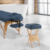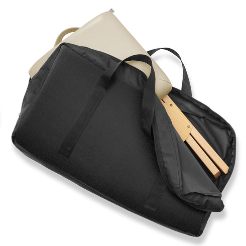 The Saloniture wood folding massage stool with carrying case features a padded seat composed of a plush, 2" thick layer eco-friendly, high-density foam providing ultimate durability and comfort. Lightweight yet sturdy construction in a streamlined design makes setup and breakdown a breeze, featuring a cushioned handle on the seat. The seat cover is made from a soft, highly durable vegan-friendly synthetic leather. Precision crafted from high-grade materials the stool features a beechwood base to accommodate a weight capacity of up to 250 lbs. Weighing just 5 pounds, the stool's compact design folds easily for transportation and storage into the included black nylon carry case with reinforced handles for easy travel. Cushion measurements: 13” x 13” x 4”. Stool height - 22-1/2". Stool height closed 24-1/2”.Saloniture designs reliable massage equipment and accessories, trusted for use in professional settings including spas, salons, and clinics.