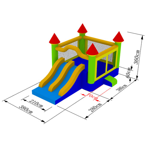 The commercial-grade Mega Double Slide by Cloud 9 is a large inflatable bounce house with a capacity of 5-10 children (150 pounds each, 1,200 pounds total). Measures approximately 22' x 15' at its base and is 12' tall. Features Side-by-side slides. Small climbing walls lead to the top of each slide. After the day of playing is through, zippered flaps allow the bouncer to be easily deflated and taken down for storage. Bouncer is constructed from 100% PVC vinyl, from its upright pillars and beams to its slide walls. All high-stress areas, including the bouncing surface, mattress sides, bottom, and slide are made from industrial strength, 15-ounce (0.47mm) PVC. Additional belting reinforcement is used at key stress points, and extra heavy-duty stitching is used throughout, further strengthening this tough bouncer. An impressive 30" tall mattress provides excellent spring force and cushioning that allows for tall leaps and comfortable landings. All materials are premium-grade, fire-resistant, and comply with the Lead Free Toys Act. Includes repair kit and ground stakes kit. Always use GCFI-protected receptacles/circuits and take caution to keep blower and power cords in dry locations. Please Note: A blower is required for use and is not included. Make sure bounce house is secured to the ground prior to use. Never use in windy or other inclement weather.