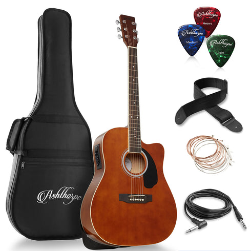 This bundle from Ashthorpe features an acoustic-electric guitar (can be played "Acoustic" without an amplifier, or "Electric" with an amplifier, not included). The guitar body is finely crafted from superior (A-grade) tonewoods; Spruce on top for its superior resilient and musical qualities, and Basswood (similar to Alder) is used for the back and sides for optimum tonal response and warmth. The underside of the soundboard is X-braced for superb structural integrity. The neck is constructed from marine grade Okoume which is extremely strong and balanced. The body is a full size (41") cutaway design, meaning the guitar body near the neck is cut back to allow easier access to the upper frets, making for more comfortable play. This guitar is a Dreadnought design (4.5" thick) which creates an unparalleled sound with a deep low end while maintaining overall tone balance. An integrated 4-band pickup equalizer with volume control knob gives you full tonal control when plugged into an amp (not included), and features adjustment slide controls for bass, mid-range, treble and presence. Two sets of steel strings are included (1 set pre-installed, just tune and play; and another set as a spare). These are made from stranded steel cores wound with stainless steel and phosphor-bronze and are coated with a proprietary anti-rust coating. They're built-to-last and sound great, with a full and perfect blend of warm and bright tones. Professional finishing touches include premium diecast chrome tuning pegs and gorgeous high-gloss finish. The complete set includes the 41" Dreadnought guitar, soft gig bag, 3 celluloid guitar picks (.46mm, .71mm and .81mm thick), on-board pickup EQ, instrument cable, shoulder strap and owner manual.