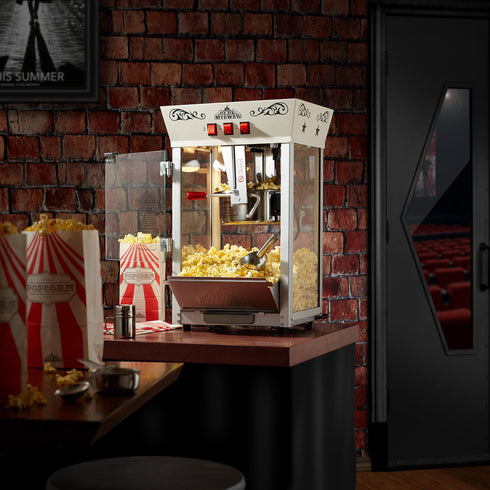 This deluxe popcorn machine is built to last. It is constructed of highly durable materials, including heavy-duty powder-coated steel and stainless steel food zones, tempered safety glass walls, vibrant premium paint, and a commercial-grade motor.