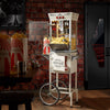 - Popcorn machine with cart: Olde Midway's popcorn machine on wheels features an antique-style design with modern features. The popcorn cart features 16" bicycle-style wheels and a cabinet with space for popcorn supplies. The large 10-ounce stainless steel kettle makes about 4 gallons of popcorn per batch. This popcorn maker ideal for home theaters, businesses, school events, parties, and more.