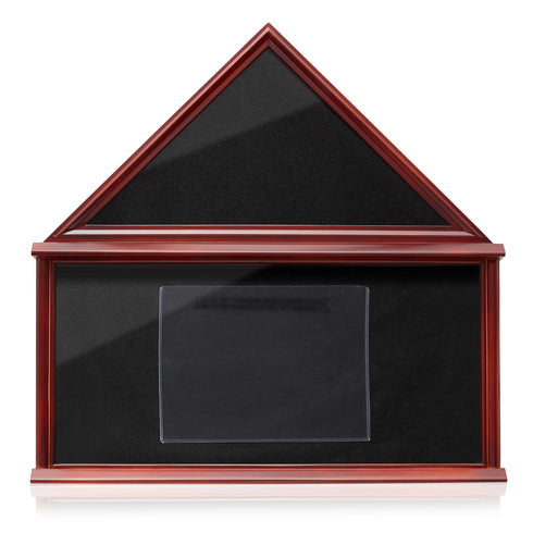 - Dimensions: Top triangle area holds 5” x 9-1/2” folded burial flag. Display Case Measurements: 25-1/4" H x 25-1/2" W x 3-7/8" D; Weight: 10.4 lbs.